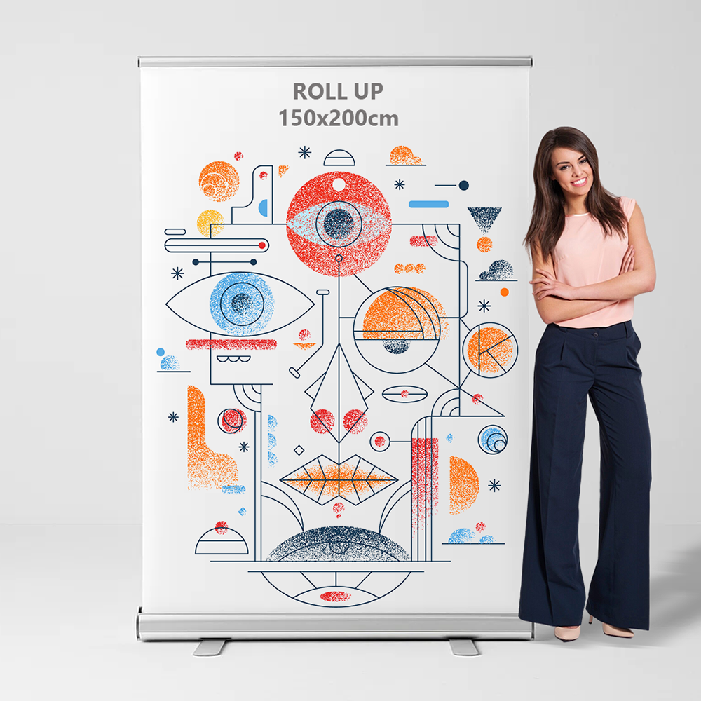 Roll Up 150x200cm com impressão personalizada, ideal para eventos, lojas e feiras. Montagem fácil e transporte prático.